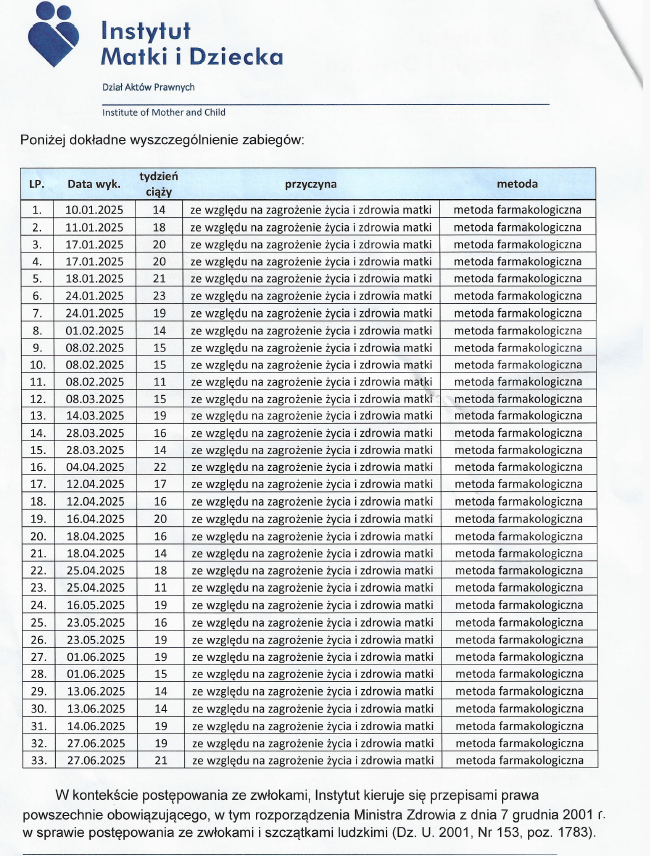 Podobnie ma się sprawa z dokumentami Instytutu Matki i Dziecka w Warszawie. W analogicznym zestawieniu dokonanych aborcji widnieje zapis: