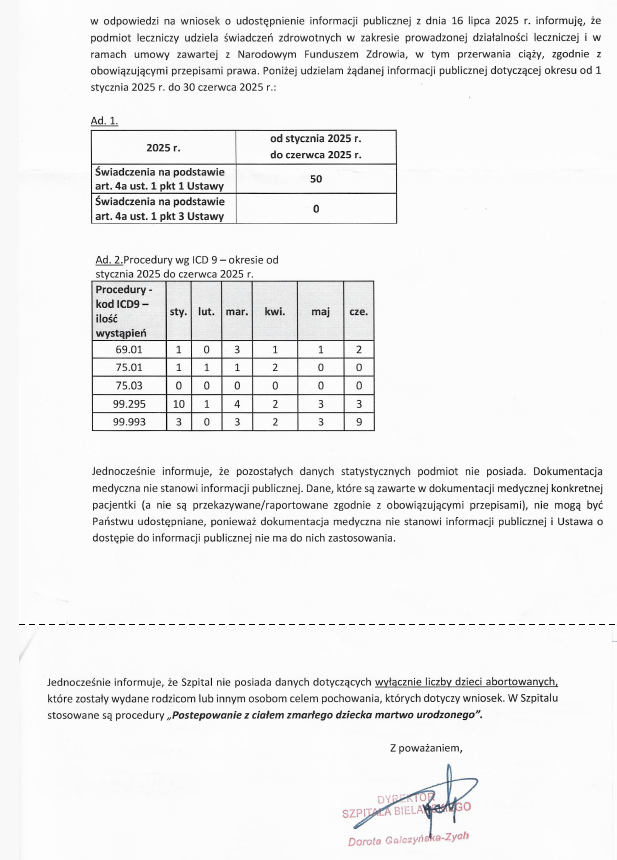 Tak kończy się pismo, które w tym roku otrzymaliśmy od Szpitala Bielańskiego. Pismo zawiera wykaz dokonanych aborcji. W ciągu pierwszych 6 miesięcy 2025 roku zabito tam pięćdziesięcioro dzieci. Fundacja Pro – Prawo do życia od wielu już lat zwraca się z wnioskami o udostępnienie informacji publicznej na temat liczby zabitych dzieci nienarodzonych tudzież „świadczeń” na podstawie Ustawy o planowaniu rodziny, ochronie płodu ludzkiego i warunkach dopuszczalności przerywania ciąży.